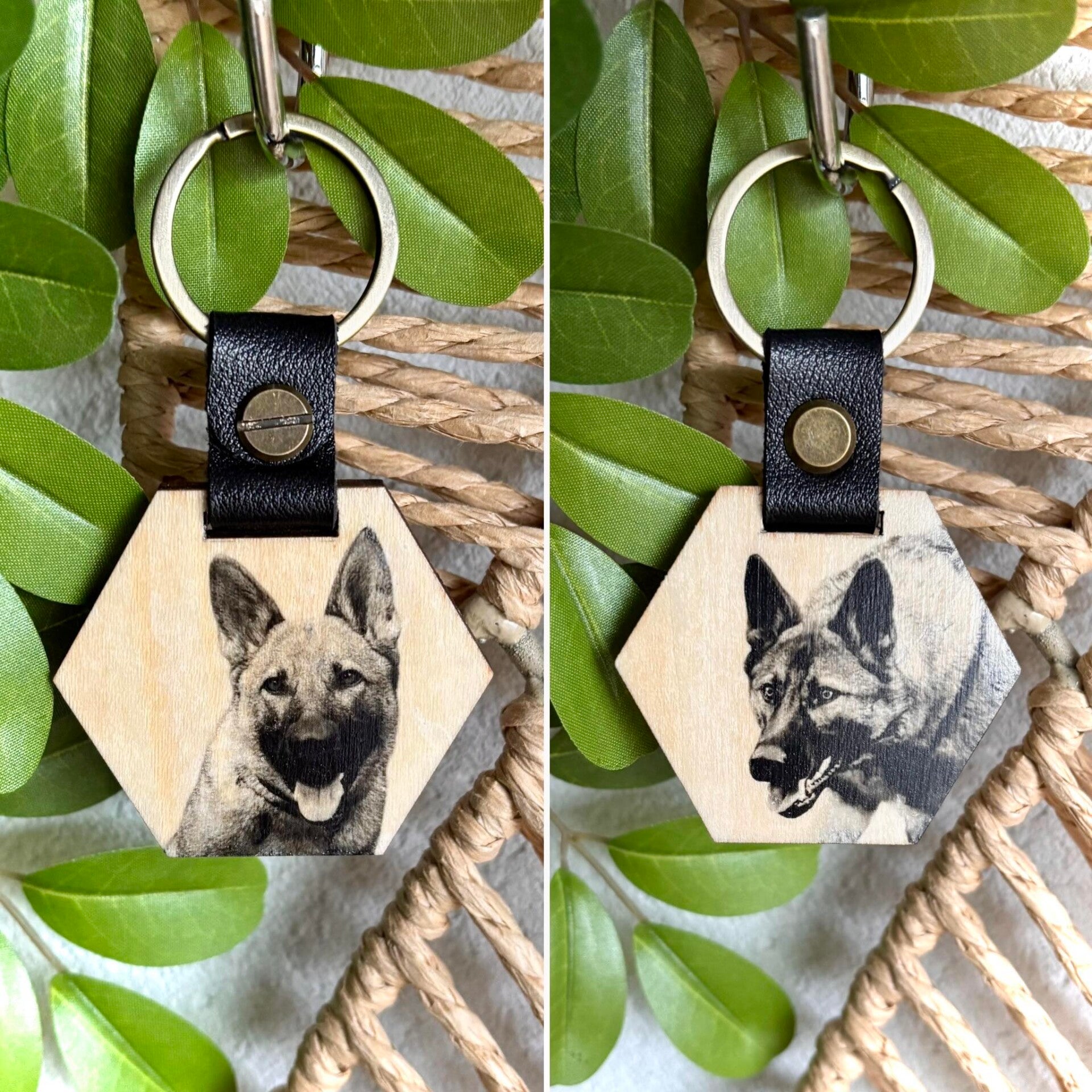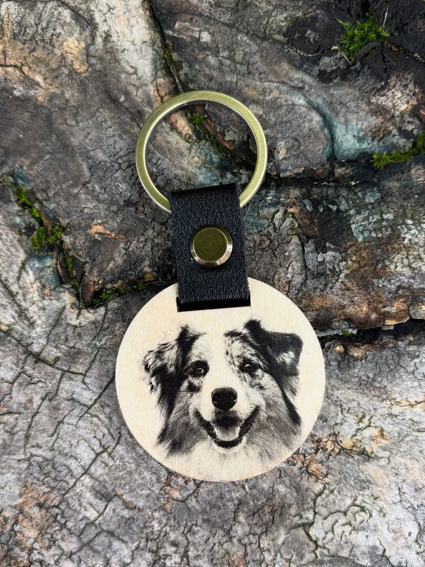Gardez votre compagnon toujours près de vous avec notre porte-clés personnalisé en bois. Un accessoire élégant et pratique, gravé avec la photo de votre chien. Le cadeau idéal pour tous les amoureux des animaux !